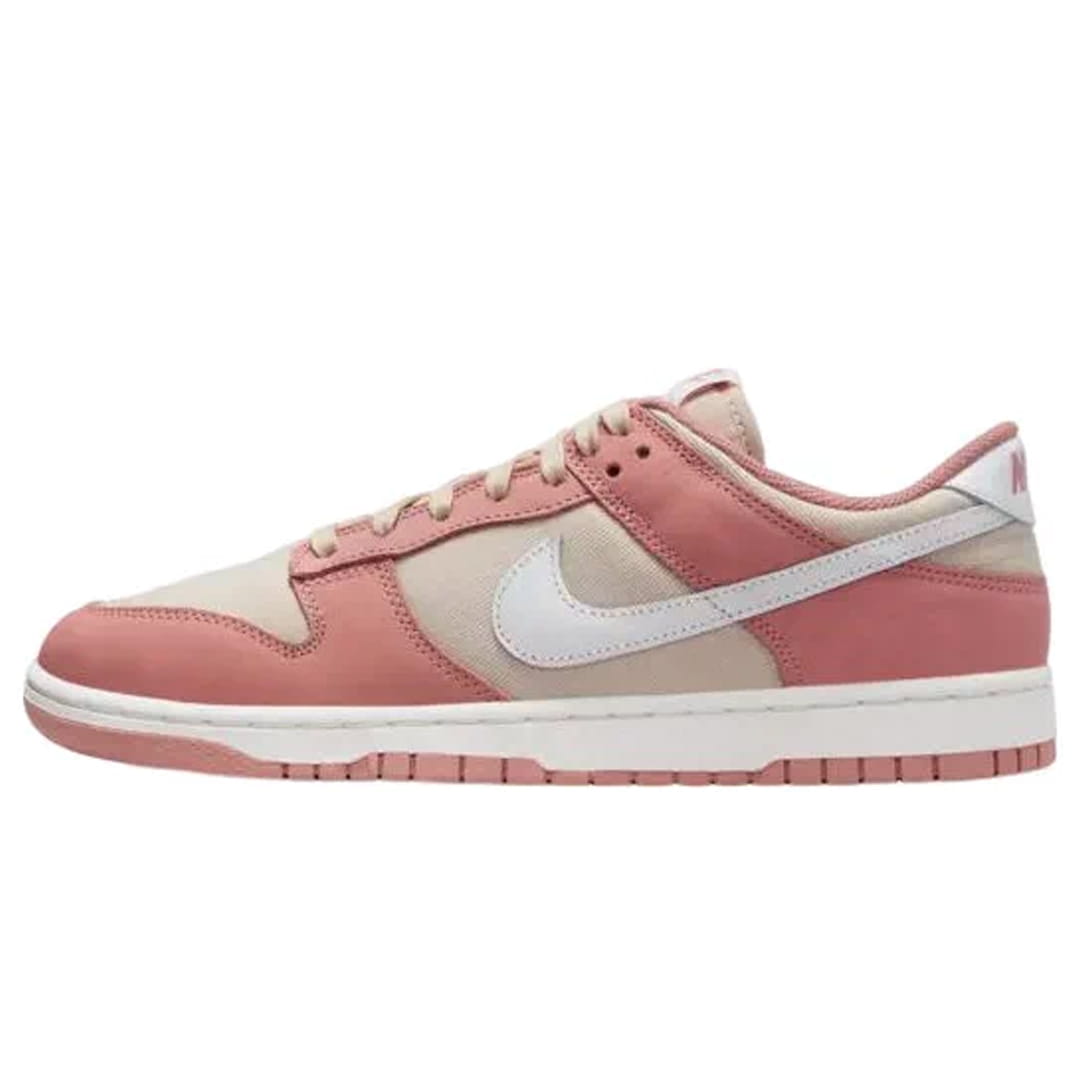 Nike Dunk Low PRM Red Stardust to świeża i stylowa odsłona kultowej bazy Dunk Low, która wyróżnia się intensywną, przydymioną czerwienią Red Stardust zestawioną z ciepłą podstawą w odcieniu piaskowym (Sanddrift) i akcentami w białym Summit White – efekt subtelnie wyważonego kontrastu. Cholewka wykonana z miękkiej skóry licowej i nubuku zapewnia solidność, komfort i premium wykończenie charakterystyczne dla wersji PRM, a warstwowe panele zamszu na palcach, panelach bocznych i pięcie tworzą wizualną głębię i strukturę. Biała podeszwa środkowa podkreśla czystość projektowej linii, natomiast gumowy outsole w tonacji Red Stardust spójnie wpisuje się w kolorystyczną narrację, zapewniając jednocześnie przyczepność. Sylwetka nawiązuje bezpośrednio do koszykarskich korzeni modelu Dunk z lat 80., ale dzięki kobiecej interpretacji i premium materiałom zyskuje nowoczesny, elegancki wydźwięk. Model charakteryzuje się niskim kołnierzem i profilowaną wkładką, które gwarantują wygodę noszenia przez cały dzień, bez utraty surowego miejskiego charakteru. Nike Dunk Low PRM Red Stardust to sneakersy lifestyle, które nie muszą krzyczeć przez neonowe barwy, by powiedzieć dużo – ich siła tkwi w harmonii kolorów, jakości wykonania i konstrukcji, która stanowi idealny punkt między klasyką a subtelnym wyrazem stylu.